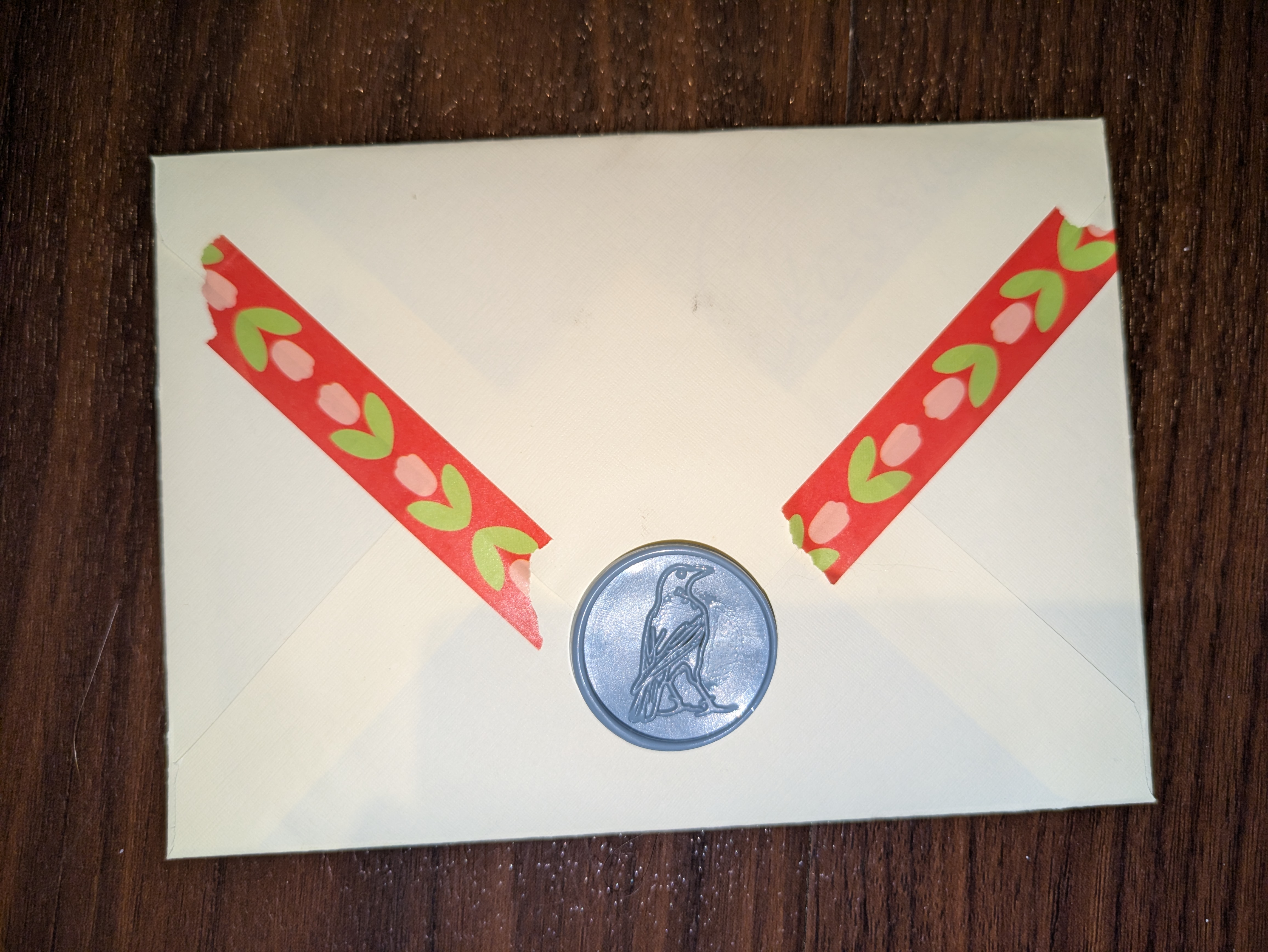 . I'm sending them some pins of their tablings and a and written letter! I made an envelope out of some fancy paper I had lying around and sealed it up my pouring a wax seal that has a crow marking on it: