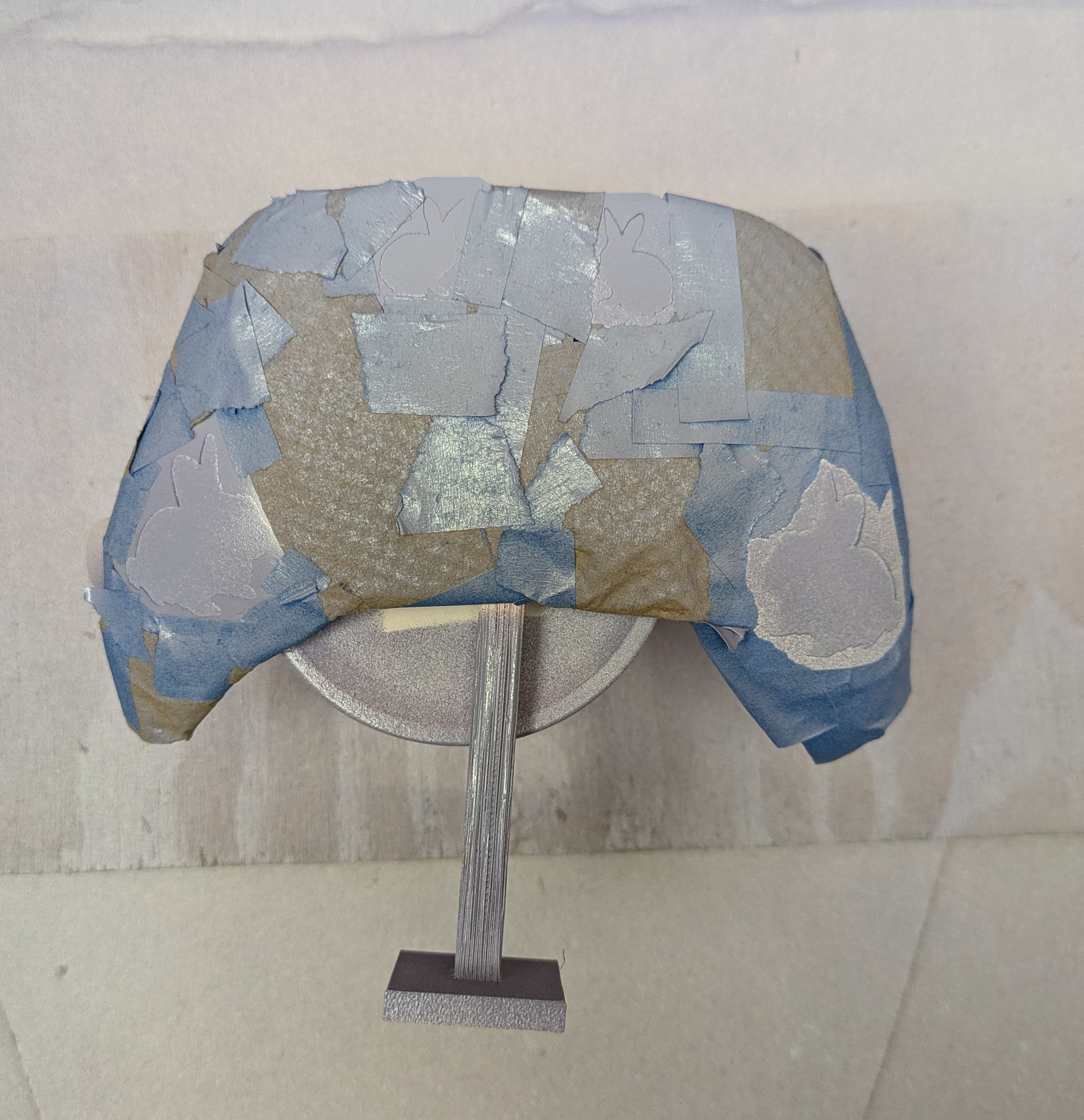 I learned a couple of tricks, first of all the stencils on the curved surfaces would kink. I made a cut on the round back of the bunny, that way the stencil would overlap it's self instead of kinking up. Second, from other testing I learned to do a few very thin coats. Any running of the paint, even minor amounts will cause the paint to run under the stencil and cause a smeary mess. Third, the adhesive I chose seems to loosen over time. It's best if I get the job done relatively quick after applying the stencils