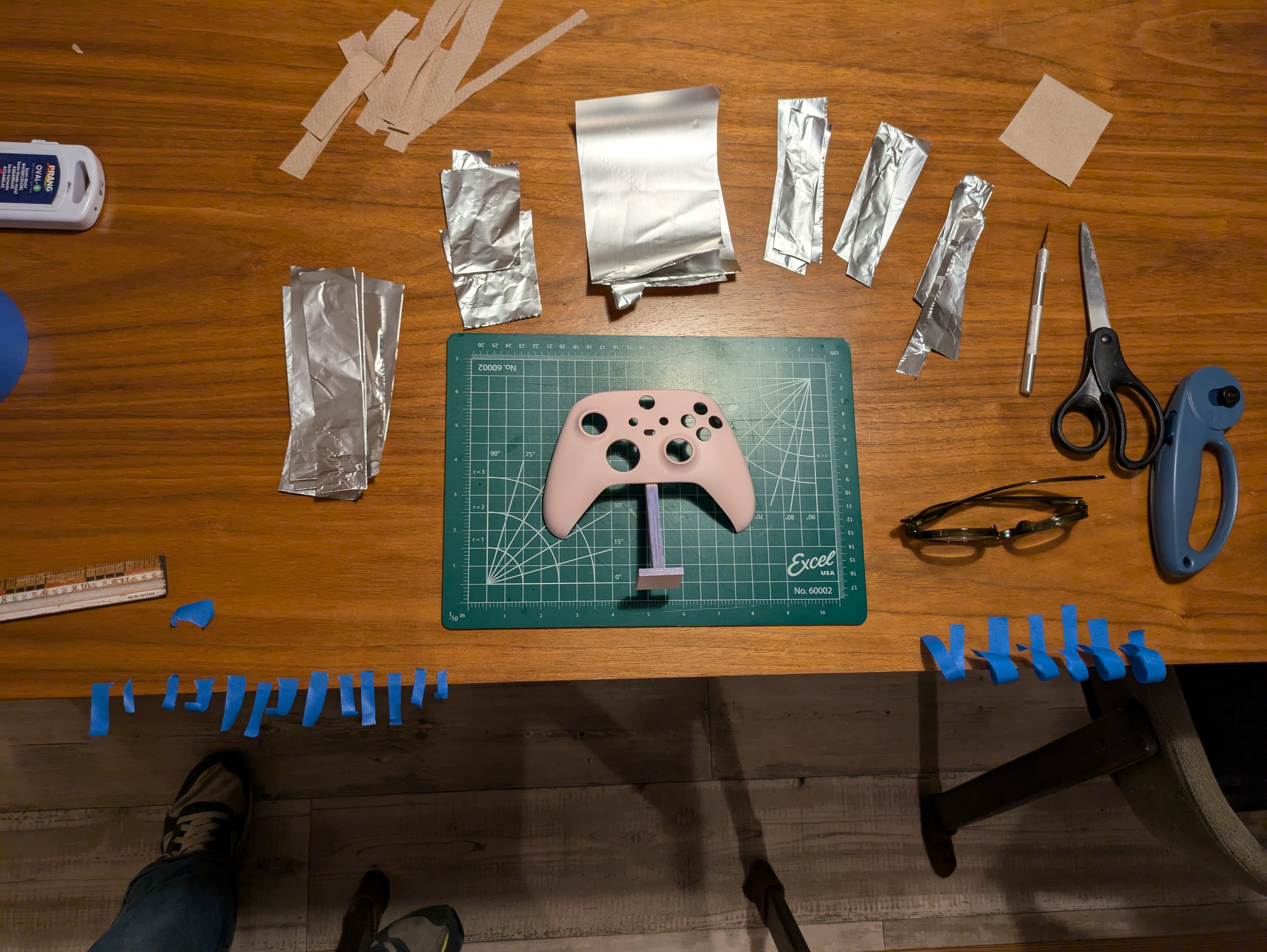 On to the real thing! This time I decided to go with tin foil instead of paper towels because it keeps its shape as you bend it. I had my workstation prepped so I could mask out the controller as quick as possible after applying the stencils.